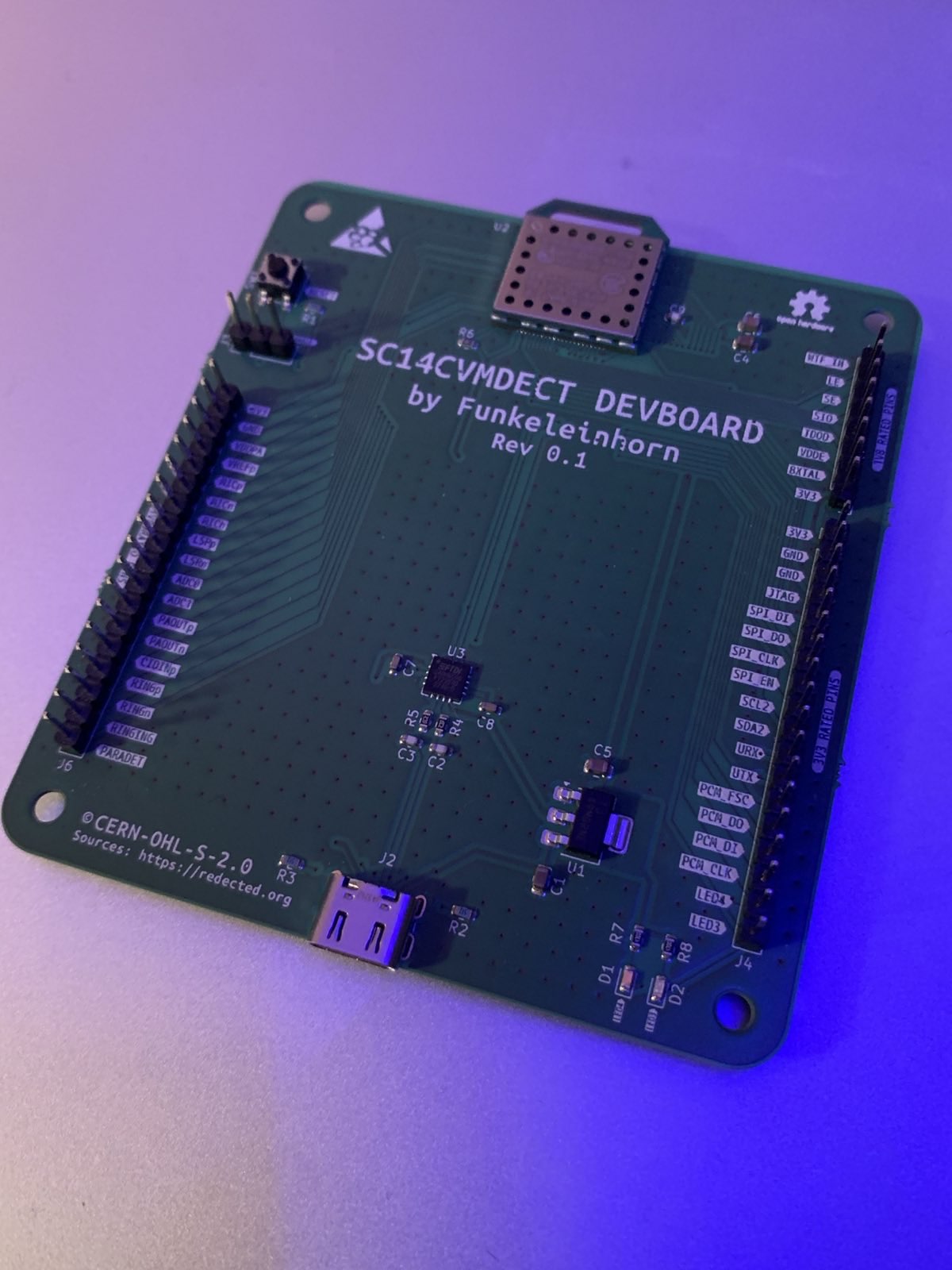 The board offers a simple breakout of the pins of the SC14CVMDECT module. It can be powered via USB-C and the UART interface of the module is exposed on USB.